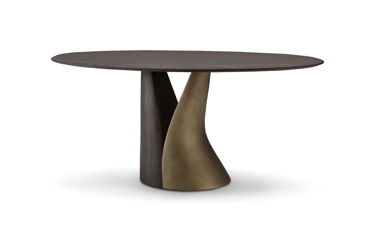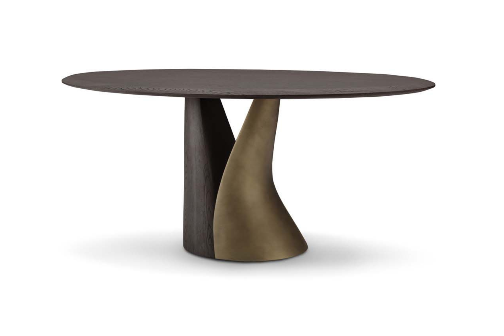 The Klaussner Dining Table is a stunning blend of artistry and craftsmanship, designed to be the centerpiece of any modern dining space. Its sculptural base combines the warmth of hardwood veneer with the elegance of a dual-tone brass finish, creating a striking balance between contemporary design and timeless sophistication. Perfect for upscale interiors, this table elevates both everyday dining and formal gatherings with effortless style.