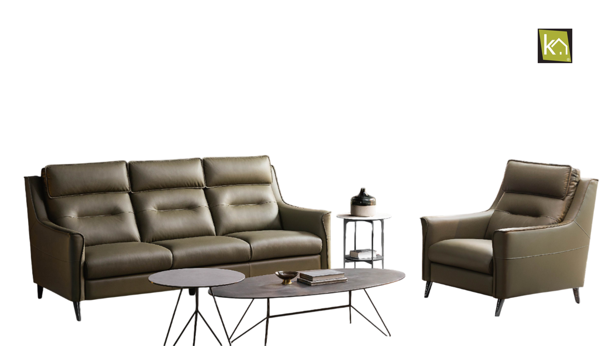 Add a touch of understated elegance to your living space with this sophisticated sofa and armchair set. The olive-green leather upholstery exudes a sense of warmth and luxury, perfectly complementing both modern and traditional interiors. With its clean lines and soft curves, the design balances contemporary minimalism with inviting comfort.